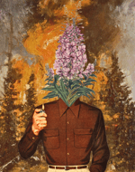 This collage brings together vintage magazine advertising from the 1960s with botanical imagery dating back to the 1700s, including references to William Curtis’s early botanical publications. At the center, a mid-century figure stands composed and anonymous, his head replaced by a towering bloom of fireweed, transforming identity into growth, resilience, and quiet defiance.