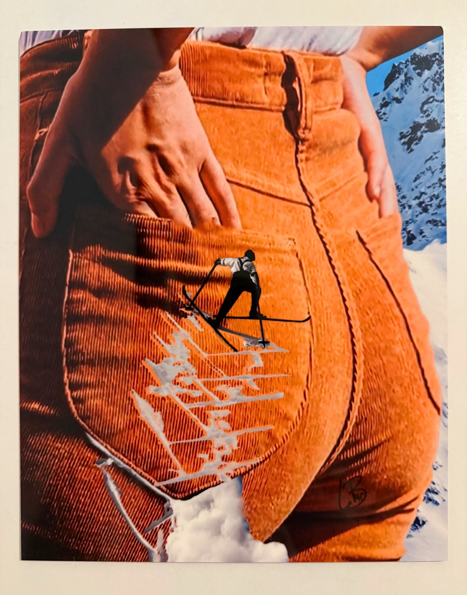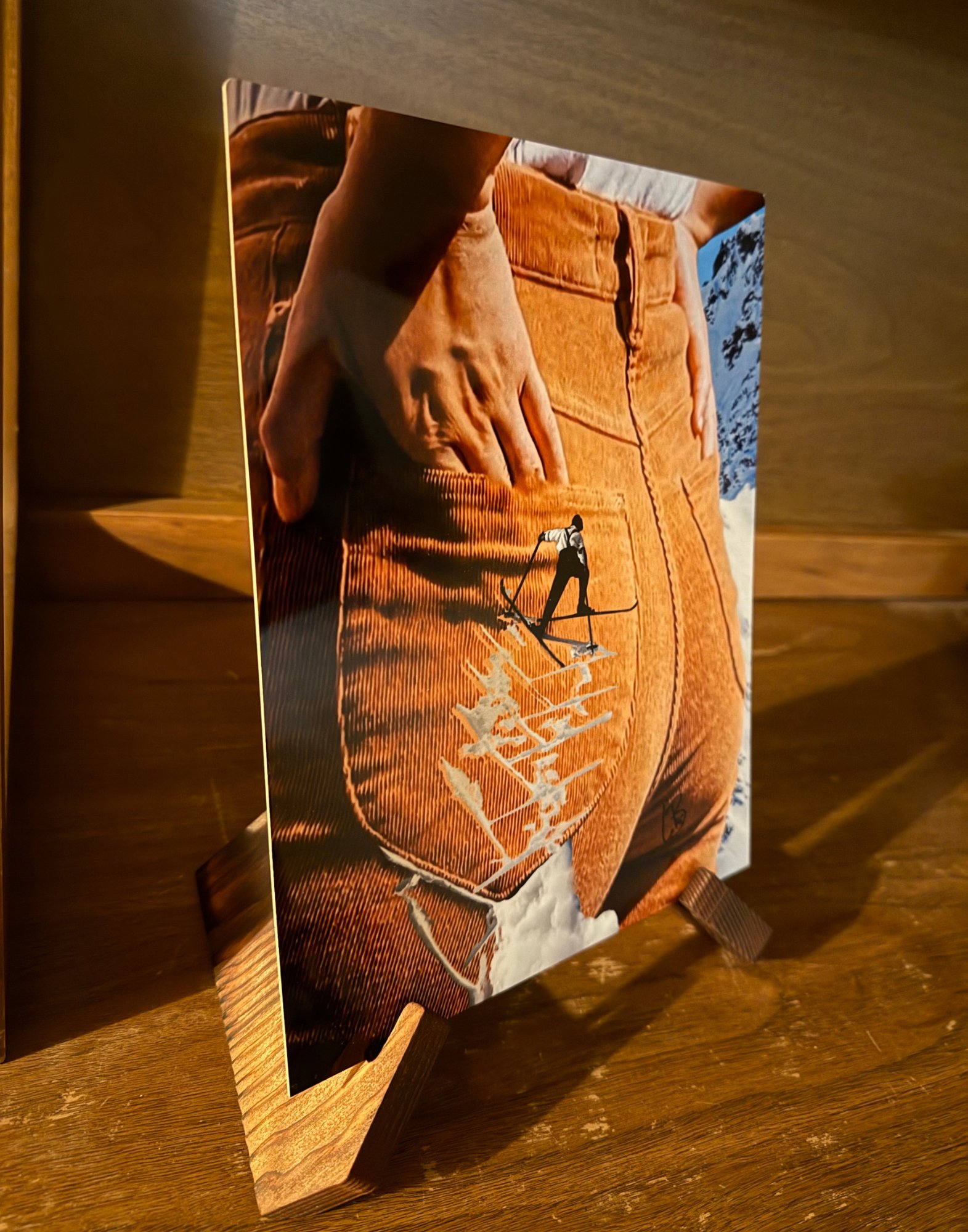 “Fresh Roy” plays with scale and texture, placing a skier carving straight out of a corduroy back pocket and into fresh snow. The ridges of the corduroy echo groomed runs, blending vintage tone, tactile texture, and mountain humor into one clean visual hit.