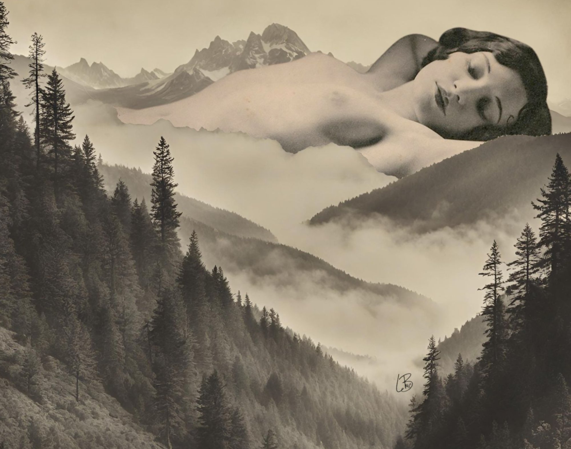 The composition moves from dense timber in the foreground to softened peaks in the distance, allowing the human presence to emerge subtly from the land itself. Rather than placing the figure onto the landscape, the collage fuses them, suggesting memory, ancestry, and nature as inseparable forces.