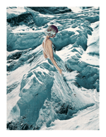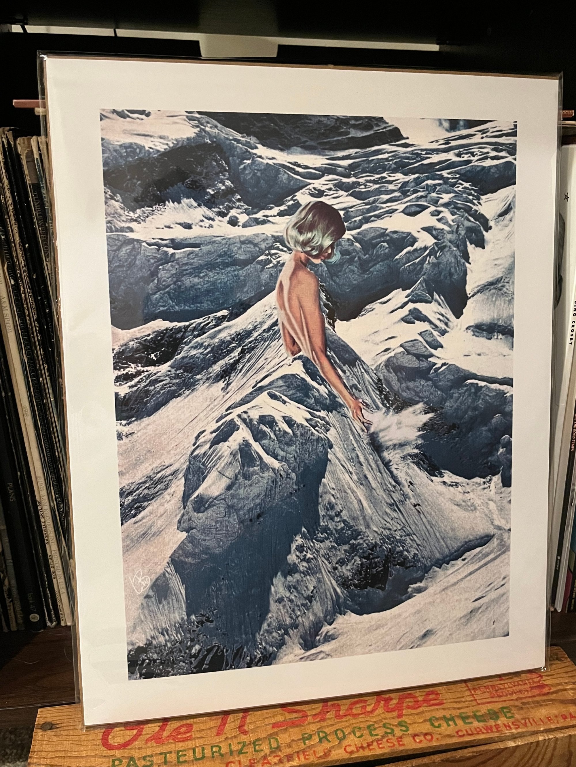 This collage merges vintage pulp magazine imagery with expansive alpine terrain, placing a mid-century–inspired woman directly within the frozen mountainscape. Her figure dissolves into snow and ice, suggesting she is both part of the landscape and the force shaping it. The composition carries a surreal tension, where beauty and danger exist in the same breath.