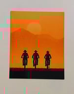 Three mountain bikers ride into the horizon beneath a blazing desert sun. “Saddle Up” captures that golden hour push forward, where western grit meets modern trail culture.