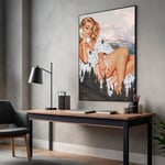 Printed on a 40 inch high by 30 inch wide canvas and finished in a walnut wood frame, this piece brings bold retro energy to modern, mid century, ski lodge, or mountain inspired interiors. It is both nostalgic and mischievous, a tribute to powder days that are just too good to miss.