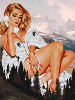The composition features a classic mid century pin up figure, reclined in quiet luxury, phone in hand as she calls out sick. Draped in a soft white fur coat, she becomes the landscape itself. Tiny skiers carve fresh lines straight down the folds of her coat, turning fabric into face shots and glamour into gravity. What should be a day of obligation transforms into a full blown powder day fantasy.