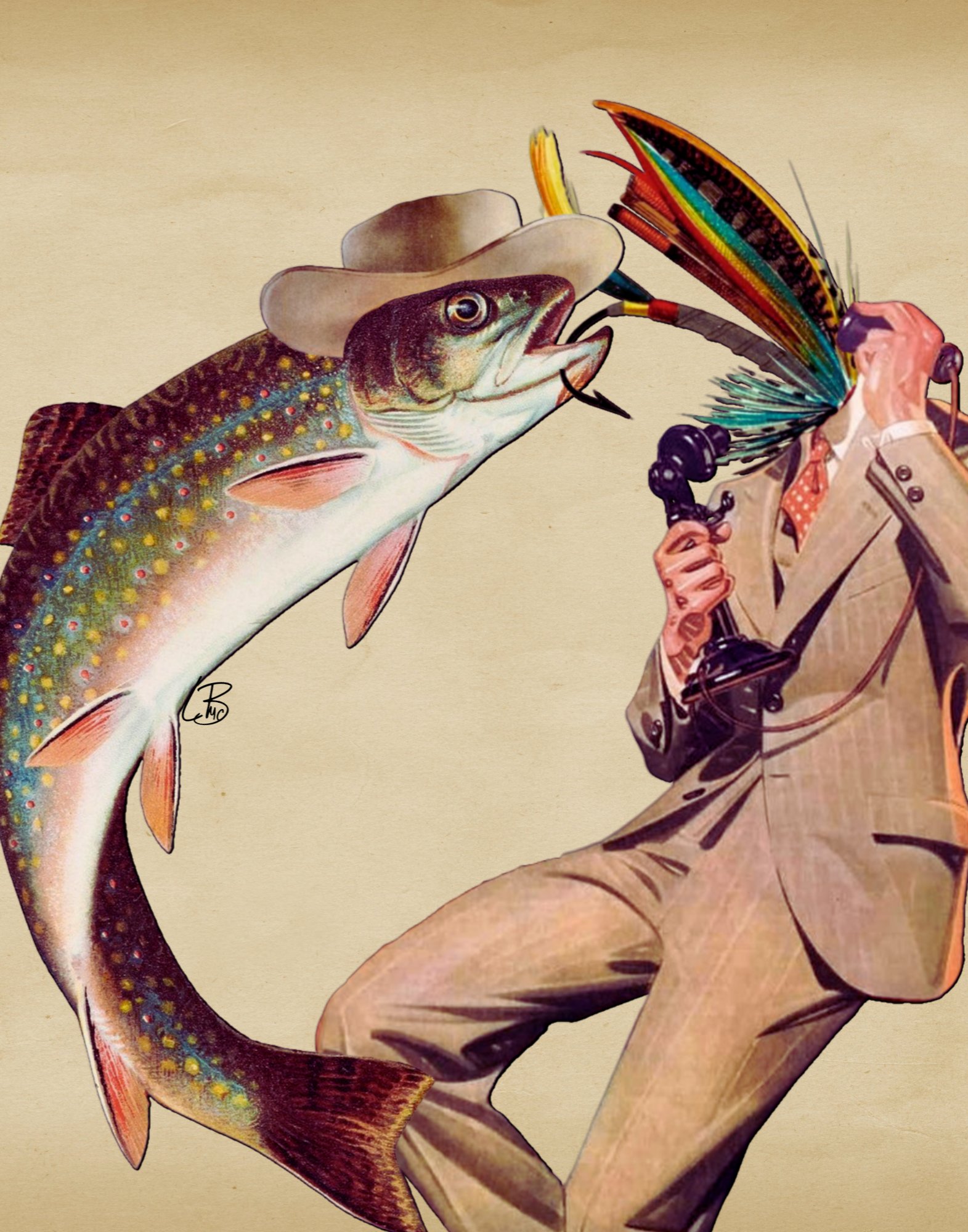 The composition is collaged using vintage advertisements from Field & Stream and mid-century fashion magazines, layered to create a narrative-rich, surreal interaction. At the center of the exchange is the fly, hand drawn by Matt Clark and inspired by the original fly-tying sketches of Charles F. Orvis, grounding the piece in the history and craftsmanship of early American fly fishing.